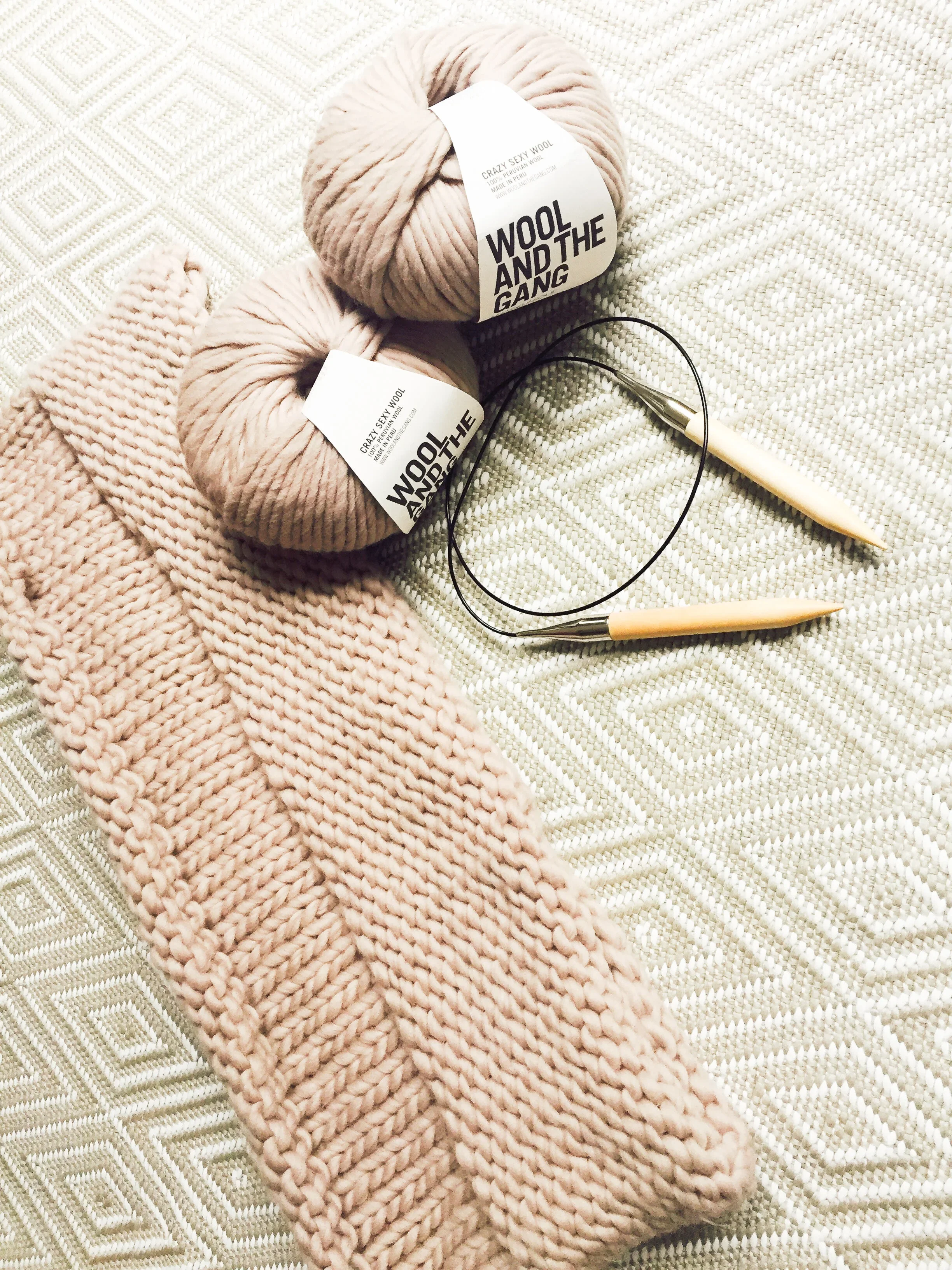 2 Skeins Wool and the Gang Crazy Sexy Wool yarn or another super bulky weight yarn (1 skein = 6 0zs/170g/108yds/98m) Color pictured is Sand Trooper Beige.