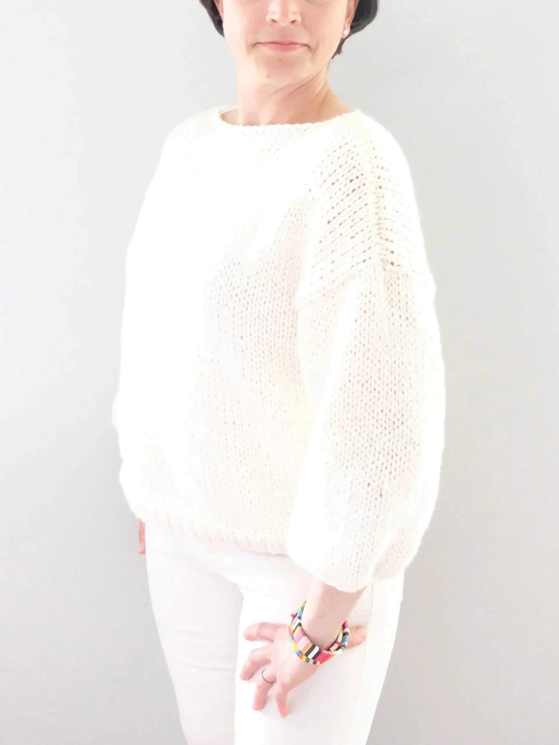 There’s nothing like a comfy, cozy summer sweater you can throw on with your favorite pair of shorts or summer jeans when you’re outside on those cooler summer nights. I wanted to design a stylish but comfortable sweater that I could live in this summer. This sweater is oversized and cropped with the perfect 3/4 length sleeves. It’s a simple design that’s easily constructed so it’s perfect for the beginner knitter and fun for the more advanced as well.
