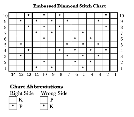 Here are the written directions for completing the embossed diamond stitch worked flat over a 10 stitch and 10 row repeat.