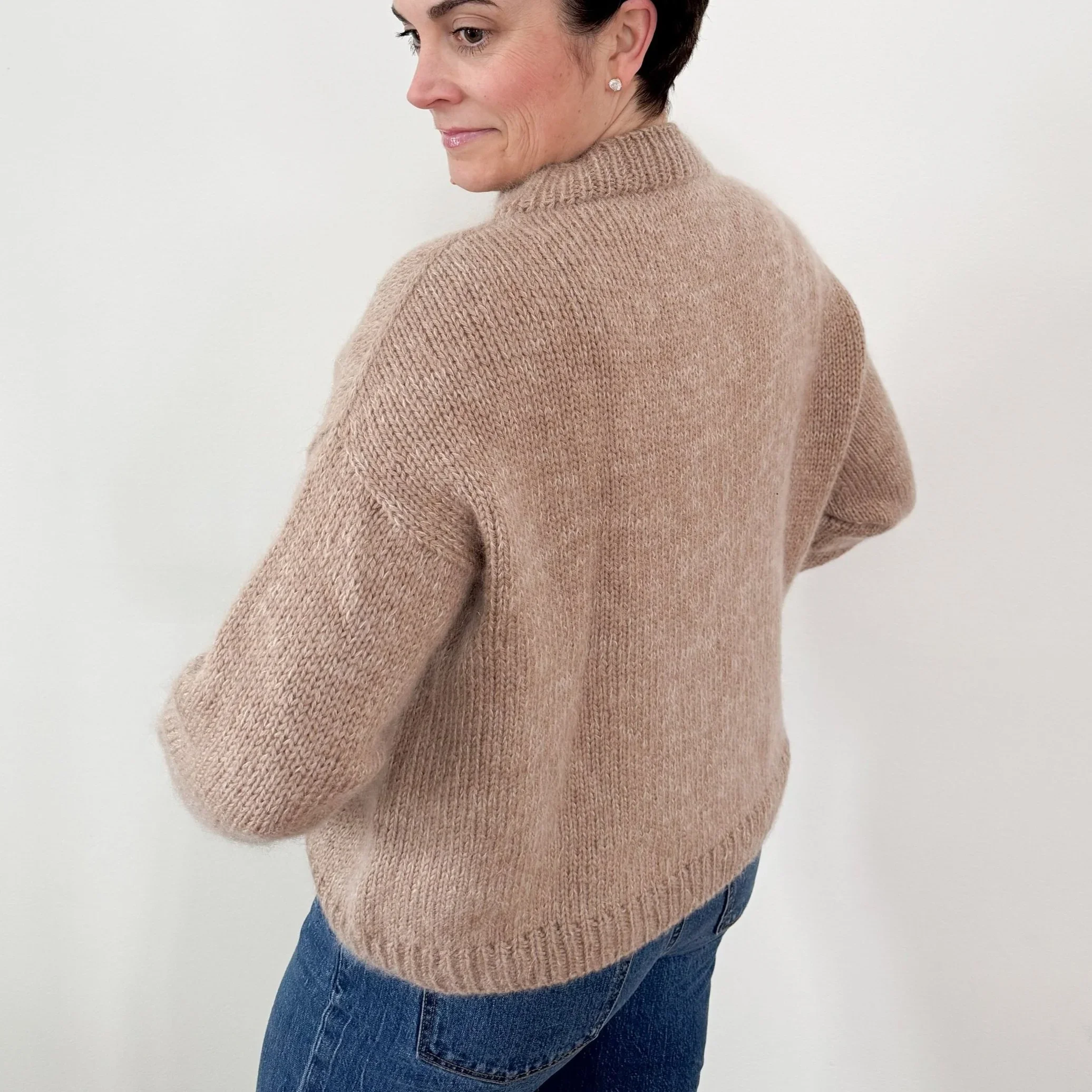 Worsted Weight: Approximately 977 (1089, 1236, 1379, 1497) (1671, 1809, 2040, 2067) yds/894 (996, 1130, 1261, 1369) (1528, 1654, 1865, 1890) m or 9 (10, 12, 13, 14) (16, 17, 19, 19) skeins of Knit Picks Wool of the Andes (110 yds/100 m per 1.8 oz/50 g skein; 100% Peruvian Highland Wool) held together with approximately 977 (1089, 1236, 1379, 1497) (1671, 1809, 2040, 2067) yds/894 (996, 1130, 1261, 1369) (1528, 1654, 1865, 1890) m or 4 (5, 5, 6, 6) (7, 7, 8, 8) skeins of Knit Picks Aloft (260 yds/237 m per 0.9 oz/25 g skein; 72% Super Kid Mohair, 28% Silk) or any other yarn that meets gauge. Colors shown are Wool of the Andes in Almond and Aloft in Oat.