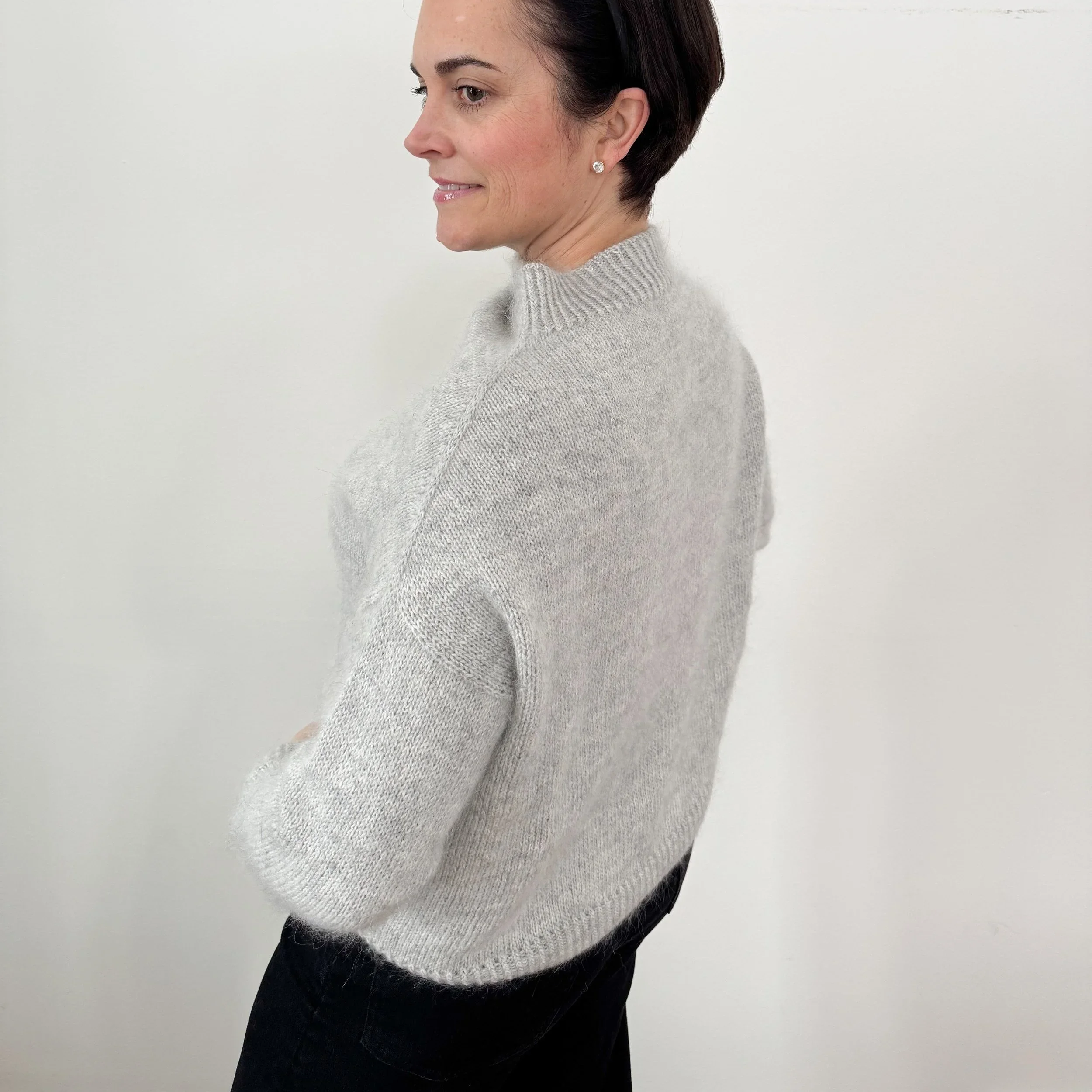 DK Weight: Approximately 1278 (1444, 1592, 1793, 1999) (2232, 2412, 2683, 2736) yds/1169 (1320, 1456, 1639, 1828) (2041, 2205, 2453, 2501) m or 8 (9, 10, 11, 12) (14, 15, 16, 7) skeins of Drops Nord (186 yds/170 m per 1.8 oz/50 g skein; 45% Alpaca, 30% Polyamide, 25% Wool) held together with approximately 1278 (1444, 1592, 1793, 1999) (2232, 2412, 2683, 2736) yds/1169 (1320, 1456, 1639, 1828) (2041, 2205, 2453, 2501) m or 6 (7, 7, 8, 9) (10, 11, 12, 12) skeins of Drops Kid-Silk (230 yds/210 m per 0.9 oz/25 g skein; 75% Mohair, 25% Silk) or any other yarn that meets gauge. Colors shown are Nord in Pearl Grey and Kid-Silk in Moonlight.