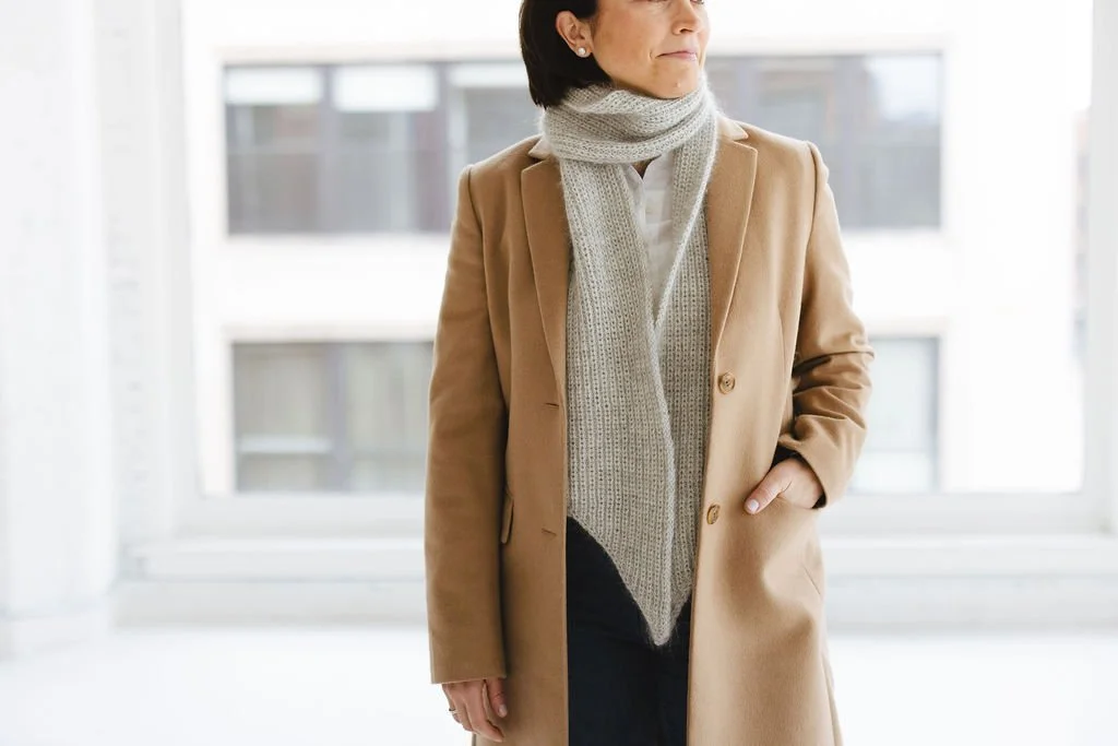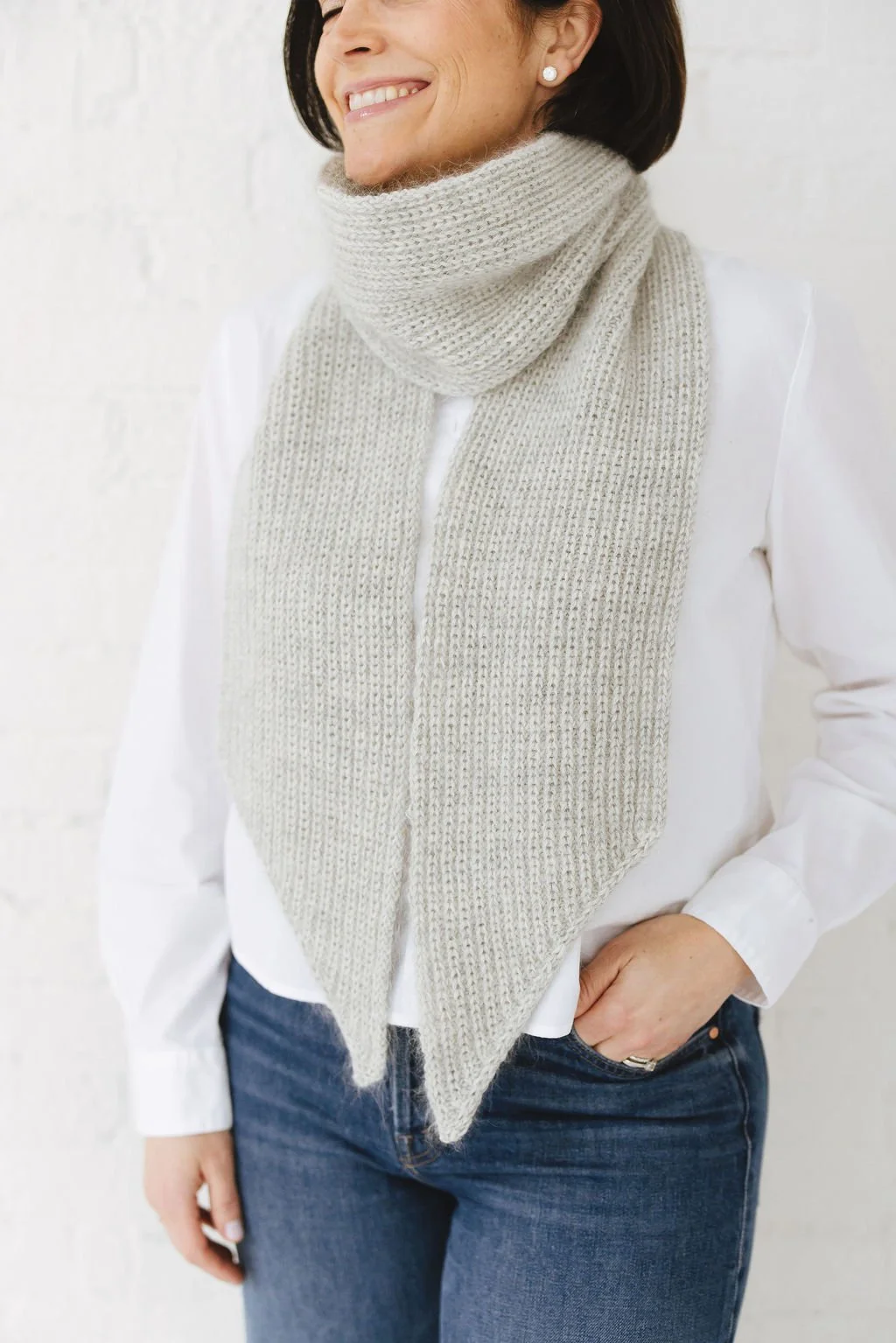 The scarf is worked flat from end to end. You begin with a narrow point and increase in half fisherman’s rib until reaching the full width. The body of the scarf is worked straight, allowing the rib to create its signature cushioned texture and clean lines. Decreases are then worked to shape the final point, echoing the beginning and giving the scarf its distinctive tapered silhouette. The result is a balanced, wearable accessory that feels classic, modern, and effortless to style.