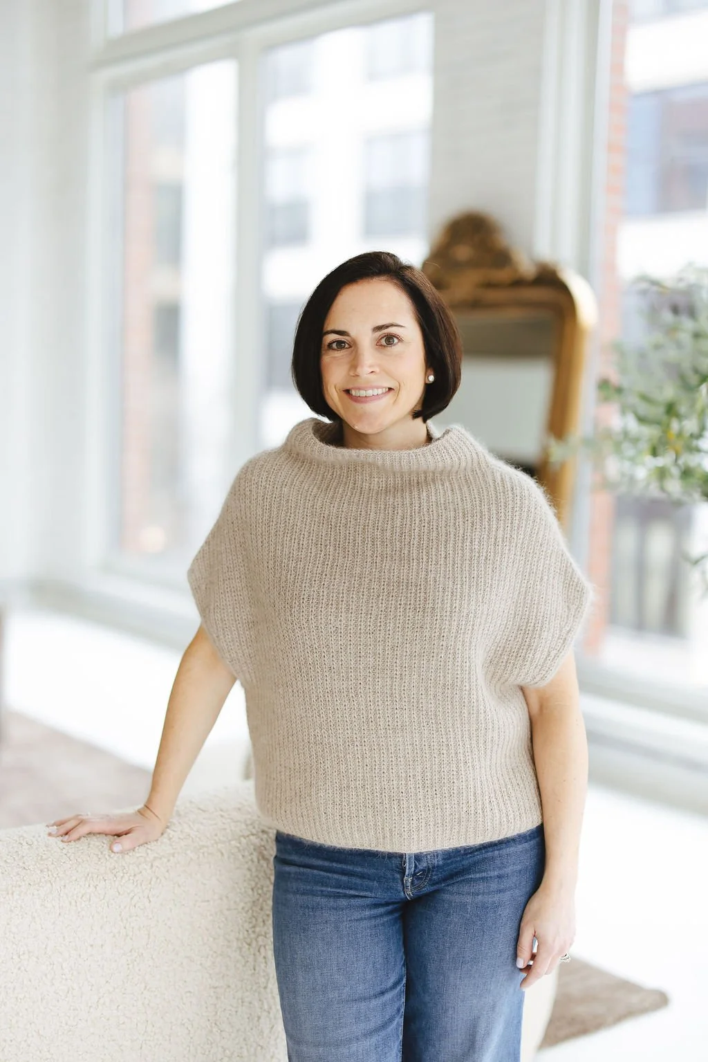 The Haven Harbor Slipover Vest is worked seamlessly from the top down. The collar is knit in the round in half fisherman’s rib, then transitions directly into the shoulders. Shoulder width is shaped with steep increases. Once the shoulders are established, the front and back are separated and worked flat to form the armhole depth, with subtle decreases along the edges for a refined, sculpted shape. The front and back are then joined and worked in the round for the body. The armholes are finished with a clean i-cord edge, adding polish to the textured fabric. The length of both the body and armholes can be easily adjusted to suit your preferred fit.