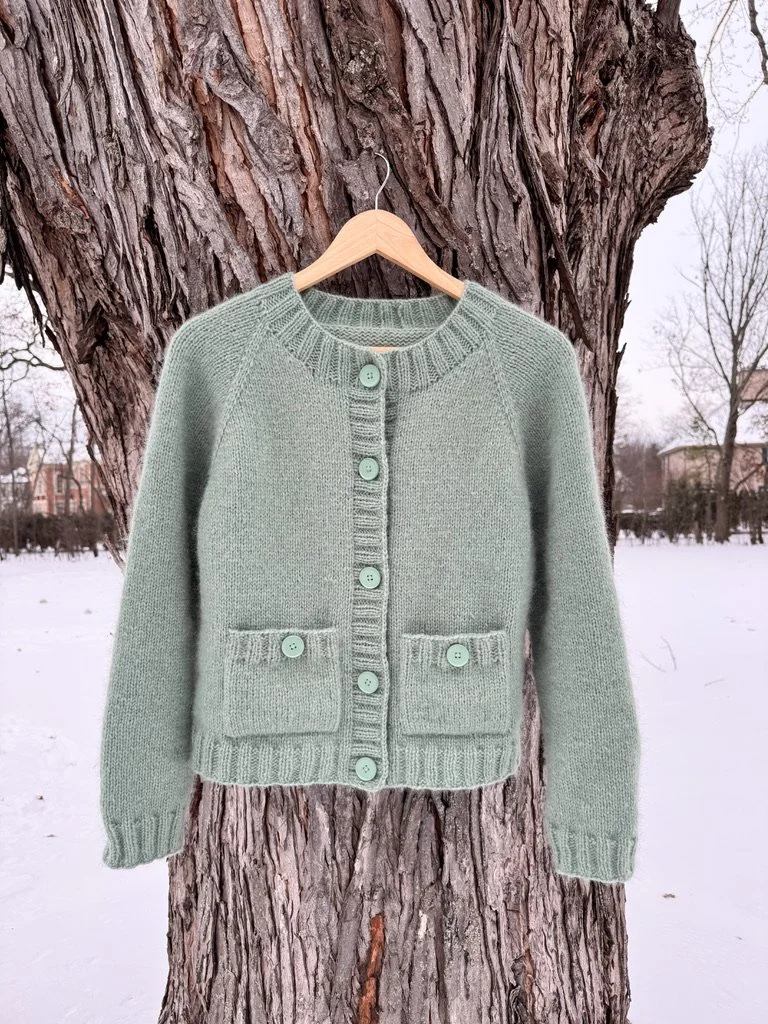 The Bridges Cardigan is a classic top-down raglan sweater featuring 2x2 ribbing for the collar, button band, and body hem. The sweater is worked flat from the top down with raglan and neckline increases to create neckline shaping. After completing raglan increases, sleeve stitches are placed on hold, and the body is worked straight and finished with 2x2 ribbing. Stitches are picked up for the button band on either side of the fronts and then stitches are picked up for the 2x2 collar ribbing, which includes an additional buttonhole. The sleeves are worked in the round with gradual decreases and finished with 2x2 ribbing. Finally, the cardigan is finished with two pockets knit separately with a buttonhole.
