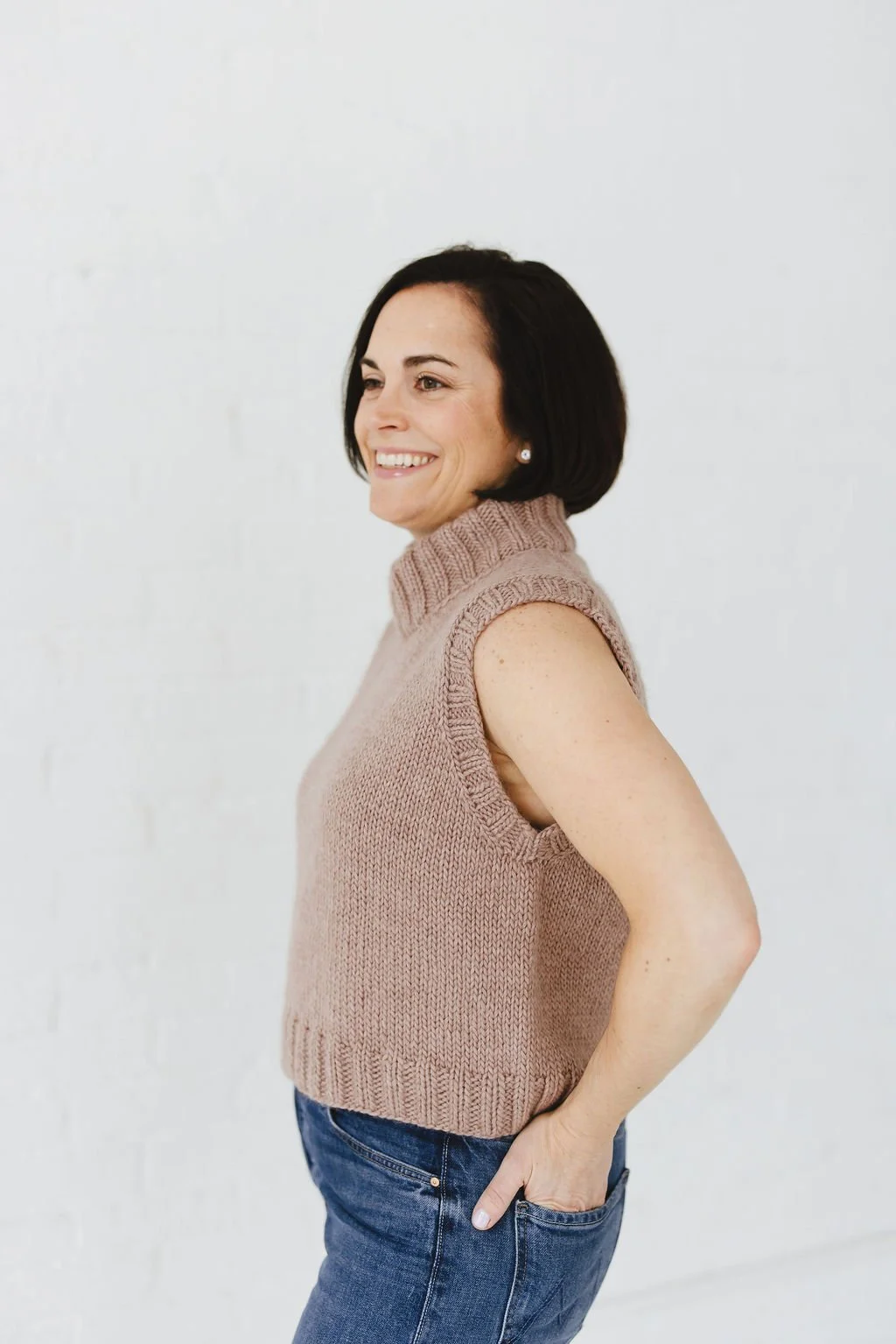 The Willow Hill Vest is worked from the top down. You’ll begin by casting on stitches for the back neck and working shoulder shaping with increases. The back is worked flat, with additional increases to form the underarms. Each front is then worked separately, shaping the neckline along the way. You join the left and right front by casting on stitches for the neckline. Underarm increases are made before joining the front and back together to work the body in the round. The collar is picked up and worked separately as a double-layered rib, and the armholes are finished with 2x2 ribbing for a clean, structured edge.